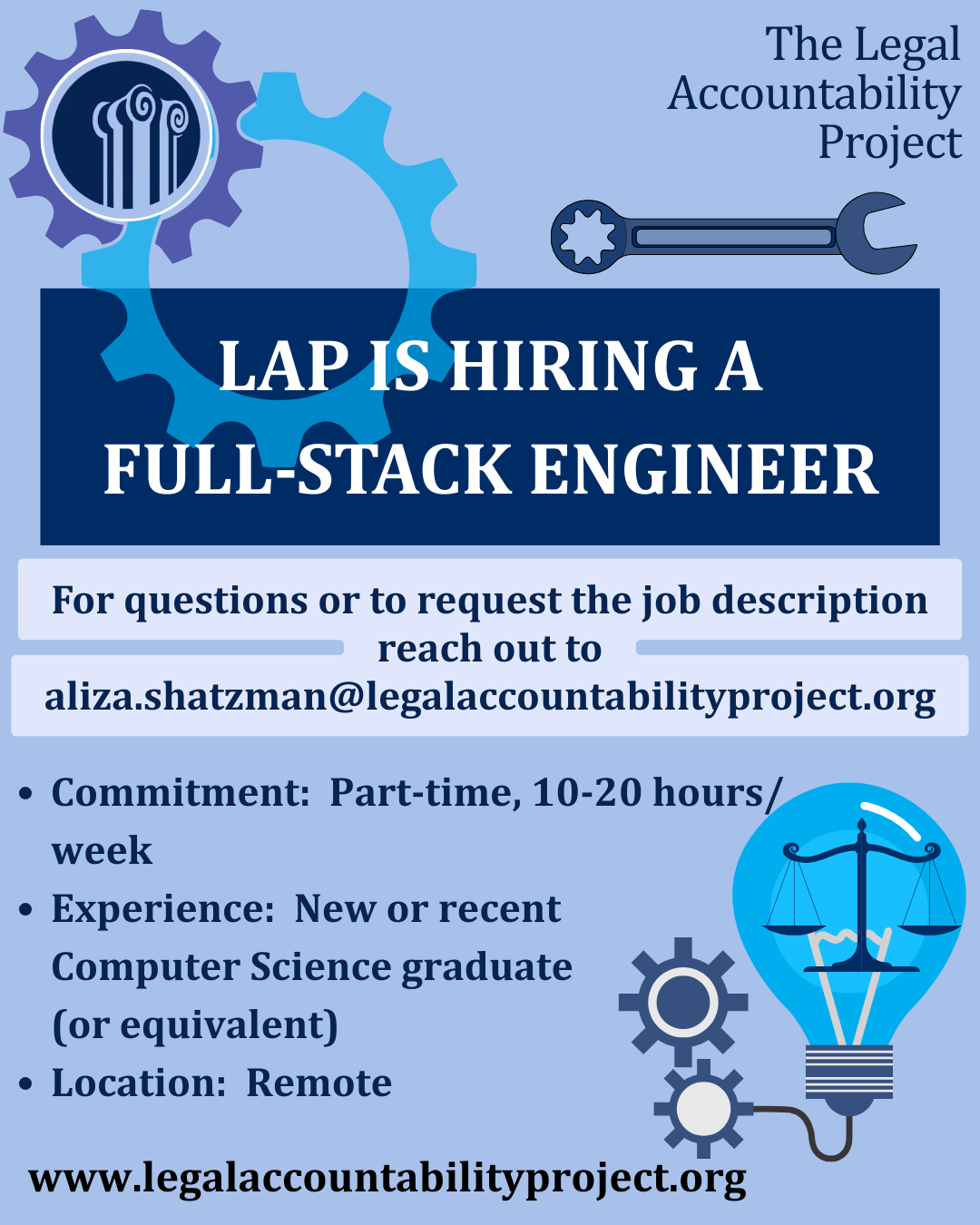 Email Aliza Shatzman at Aliza.Shatzman@legalaccountabilityproject.org for the full job description.