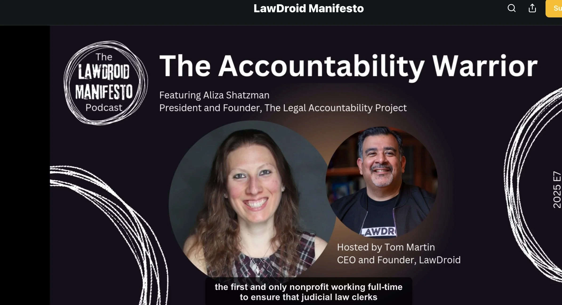 If you want to understand how power imbalances and lack of workplace protections in the judiciary harm young lawyers, and how technology can drive accountability in traditionally opaque institutions, listen to this episode. LAP’s Aliza Shatzman has transformed the clerkship landscape through an innovative legal tech platform that exposes judicial misconduct and empowers law students to make informed career decisions.